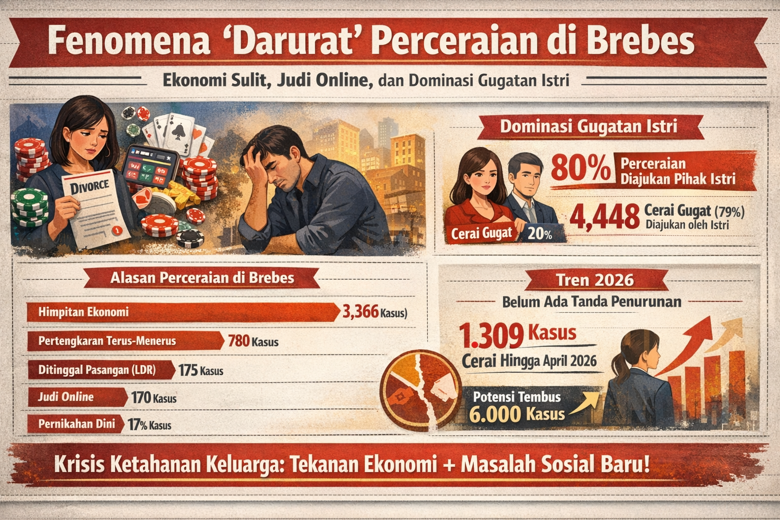Berdasarkan data resmi Pengadilan Agama (PA) Brebes, sepanjang tahun 2025 tercatat sebanyak 5.611 perkara perceraian yang masuk. Dari jumlah tersebut, sebanyak 4.132 pasangan resmi bercerai. Angka ini menempatkan PA Brebes di peringkat ke-7 nasional secara historis dengan total akumulasi mencapai 71.121 putusan cerai.