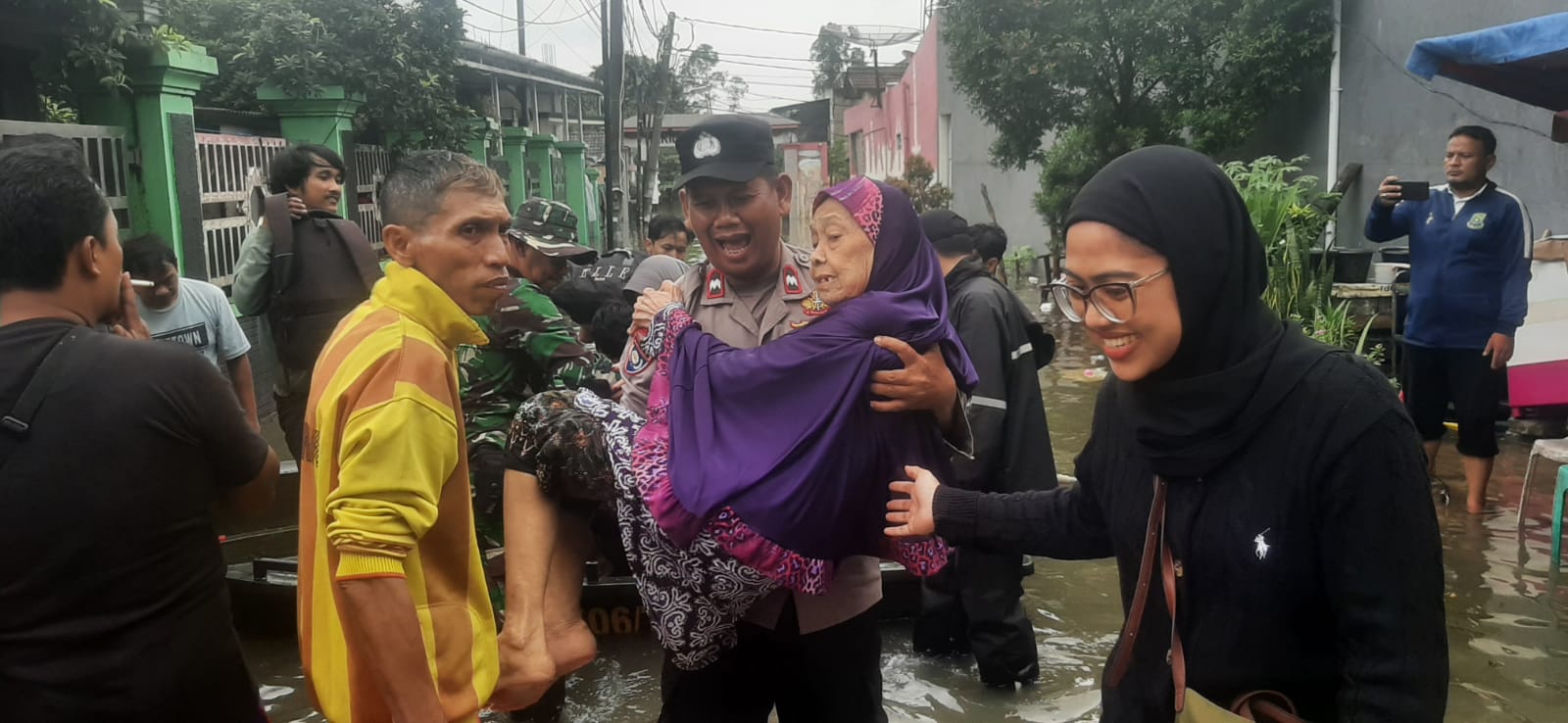 Sejak debit air mulai naik dan merendam permukiman, aparat kepolisian langsung berada di lapangan untuk membantu warga yang terjebak genangan, terutama di wilayah dengan kedalaman air yang cukup tinggi.